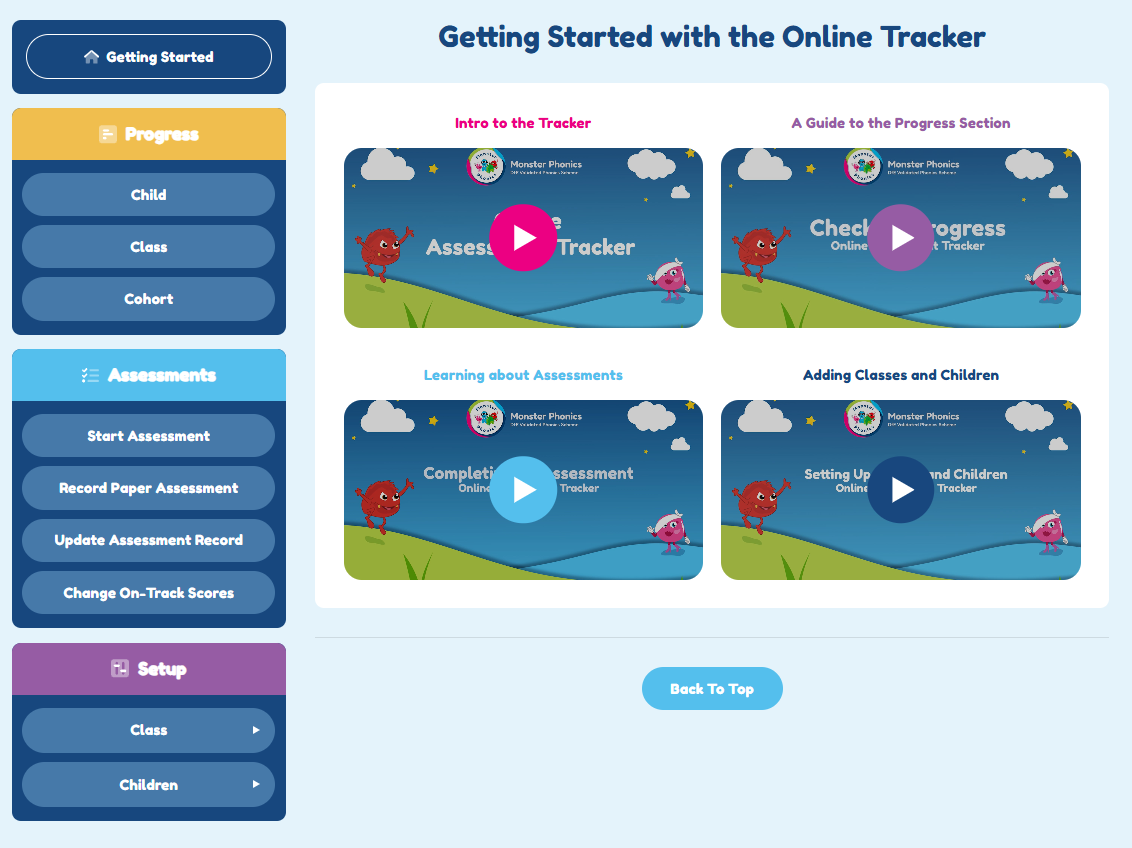 At the start of the Tracker you’ll arrive at the Getting Started screen, which includes videos on key topics such as an introduction to the Tracker, checking progress, learning about assessments, and adding classes and children. This is a great place to begin if you’re setting up or want a refresher. We also add new videos here to cover more areas over time.
